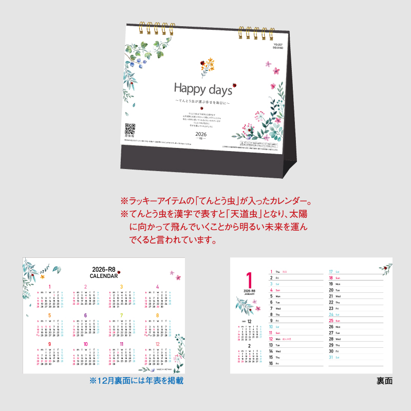 ※ラッキーアイテムの「てんとう虫」が入ったカレンダー。※てんとう虫を漢字で表すと「天道虫」となり、太陽に向かって飛んでいくことから明るい未来を運んでくると言われています。※12月裏面には年表を掲載