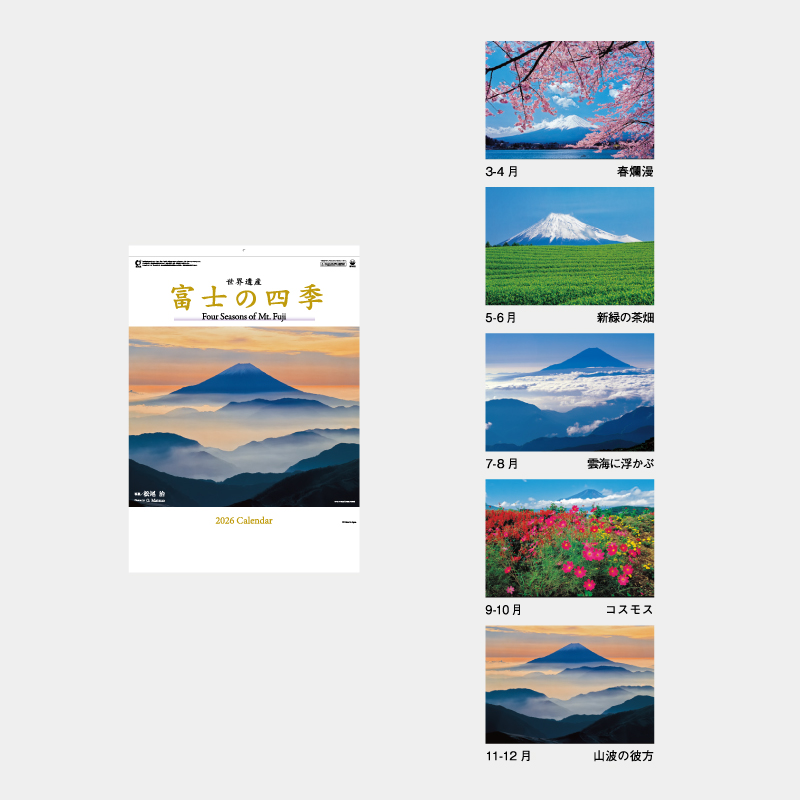世界文化遺産に登録されて以来、ますます人気が高まる富士山。その美しい姿は、日本一から世界の富士山へと多くの人を魅了しています。山岳写真家である松尾治氏は富士山を20年にもわたり撮り続けています。季節ごとに表情を変える秀逸の姿を、1年間通してお楽しみいただけます。