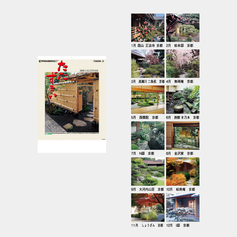 風雅な庭園の石や緑の織りなす美しい造形は見事です。色づく木々や積もる雪など日本の季節の移ろいを感じられるこのカレンダーは、不動産・建築・造園関係に最適な販促品といえます。
