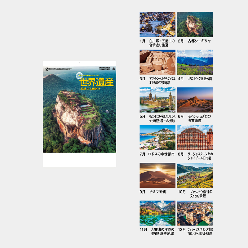 - 日本では世界遺産の登録が相つぎ、今まで以上に「世界遺産」に関心が集まっています。歴史が育んだ素晴らしい景色を楽しんでいただくため、コンパクトな菊4切サイズに。地図と解説がついて情報も満載です。いつか訪れる日のためにも、まずはカレンダーでお楽しみください。