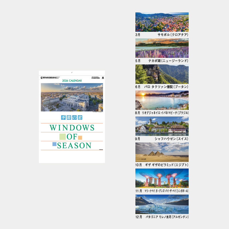 - 世界の景勝地を撮影したパノラマ写真をワンポイントに、機能性を重要視したカレンダーです。メモスペースも広く、ボールペンや鉛筆でも書きやすい用紙を採用するなど、使う人にやさしいカレンダーです。